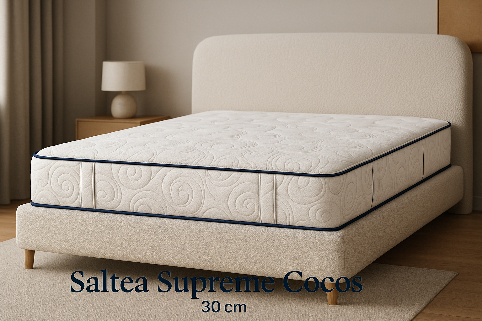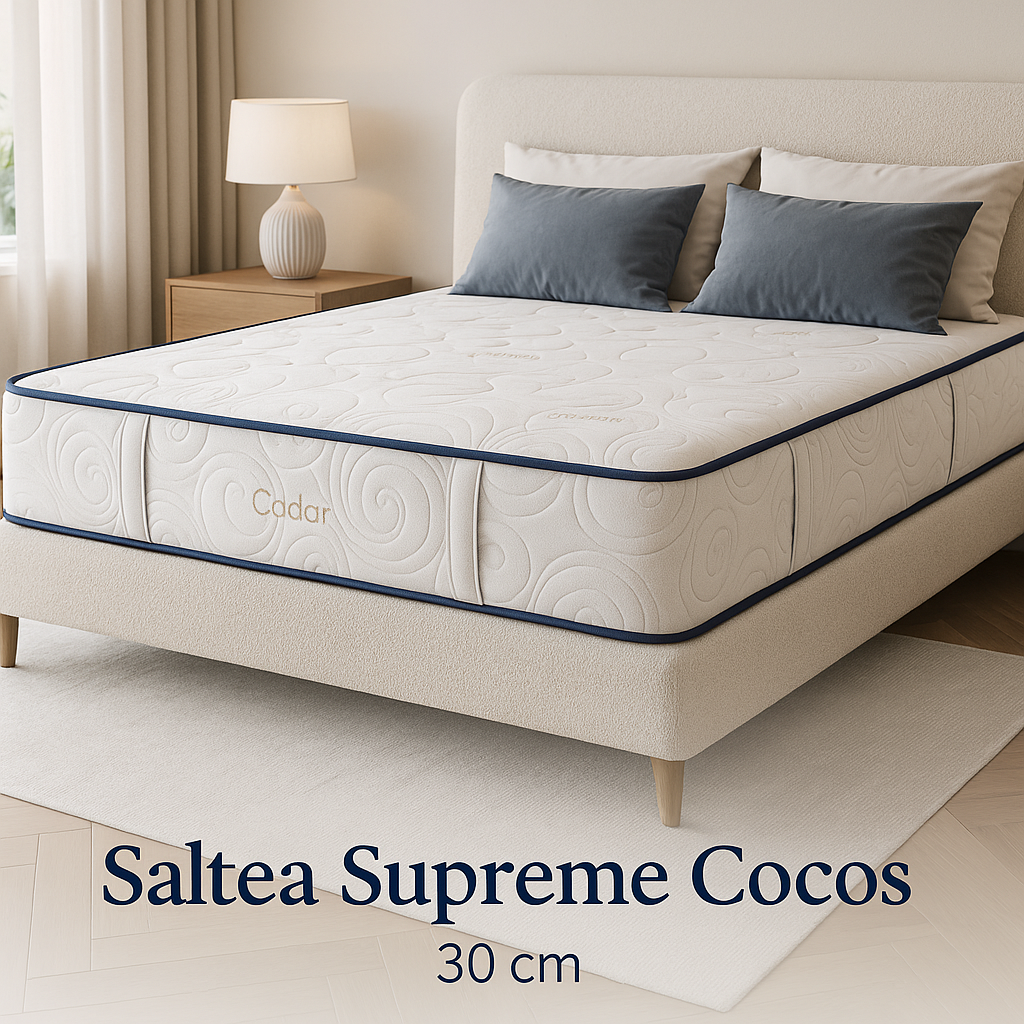 Saltea SuperOrtopedica Supreme Cocos, 30 cm detine o husa de acoperire matlasata si compactata pe un suport textil de vata volumica antialergica, cu densitatea de 200g/m2 impreuna cu un strat de spuma poliuretanica de 1 cm grosime cu densitate de 23 Kg/m3. Banda laterala este matlasata impreuna cu o banda de poliuretan de 6 mm, prevazuta cu aerisitoare pe ambele parti.